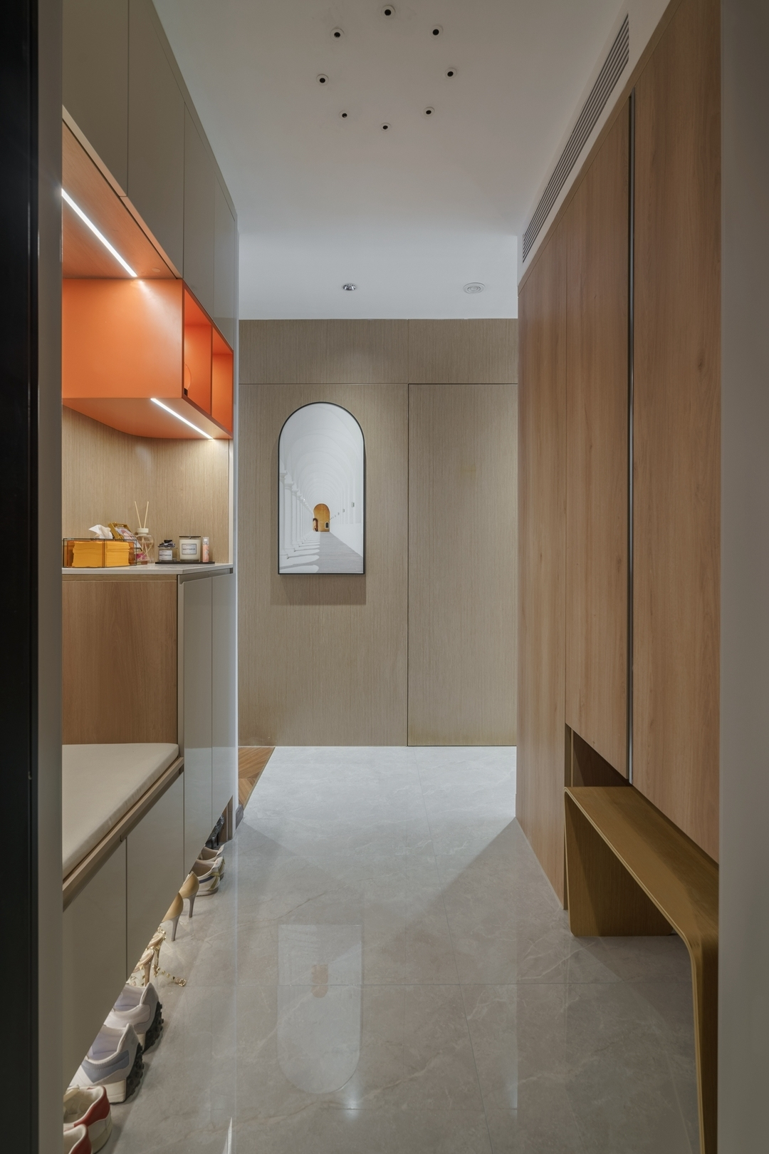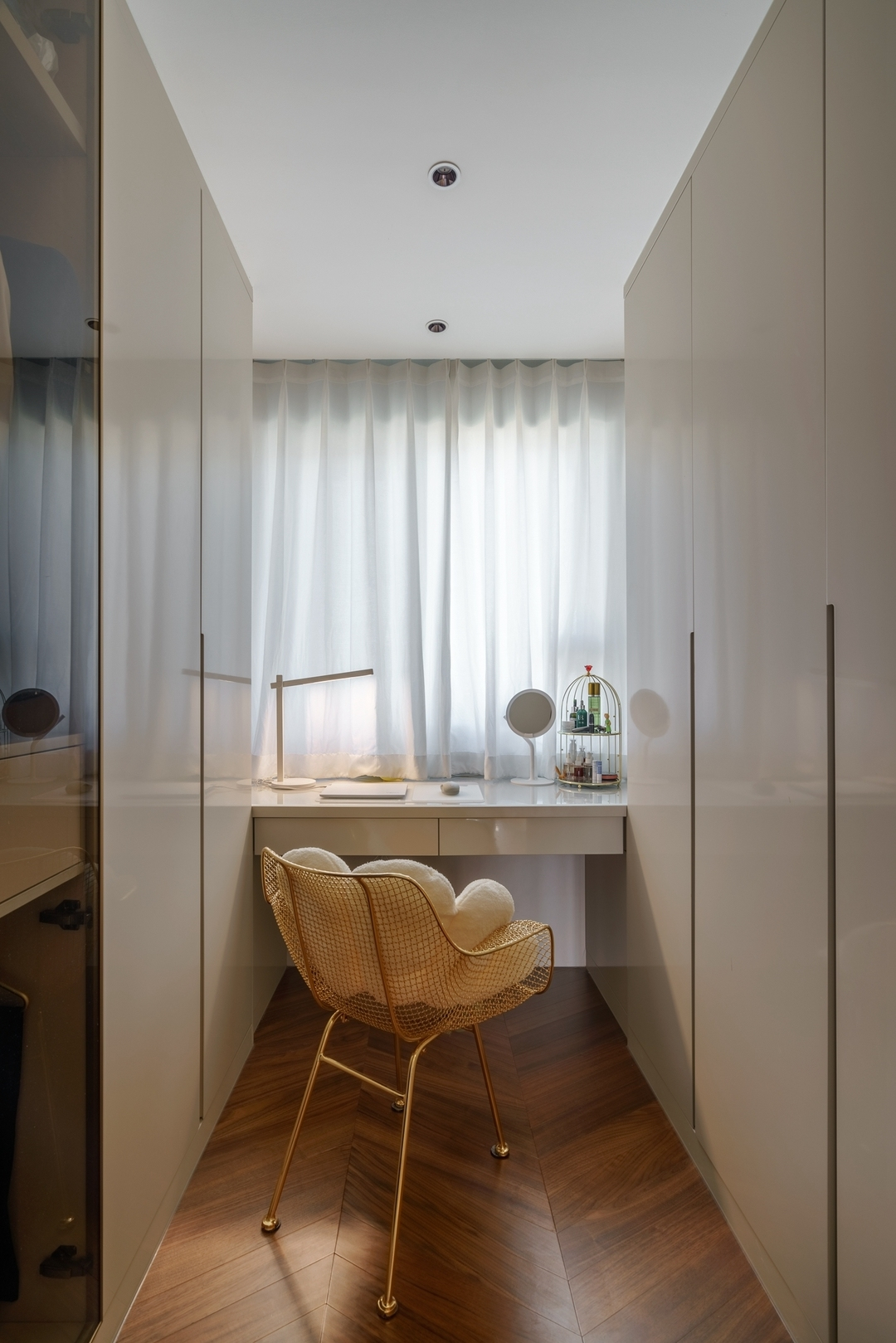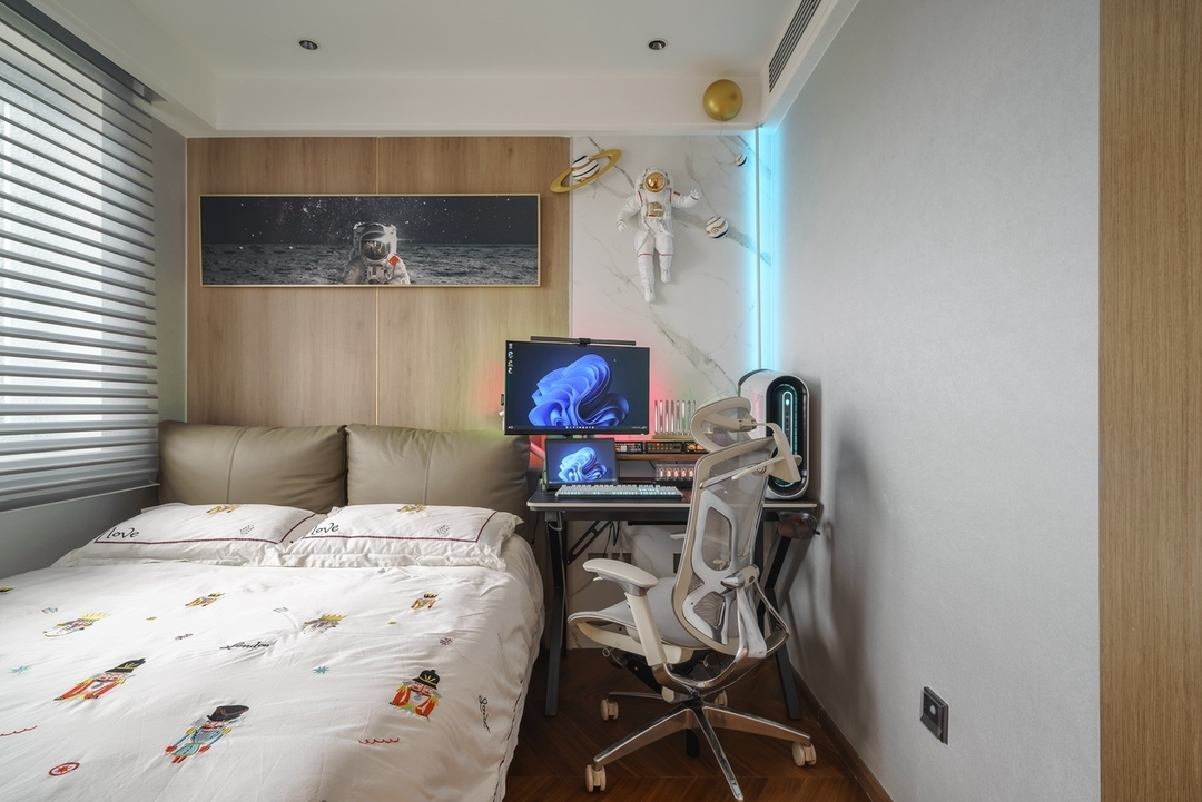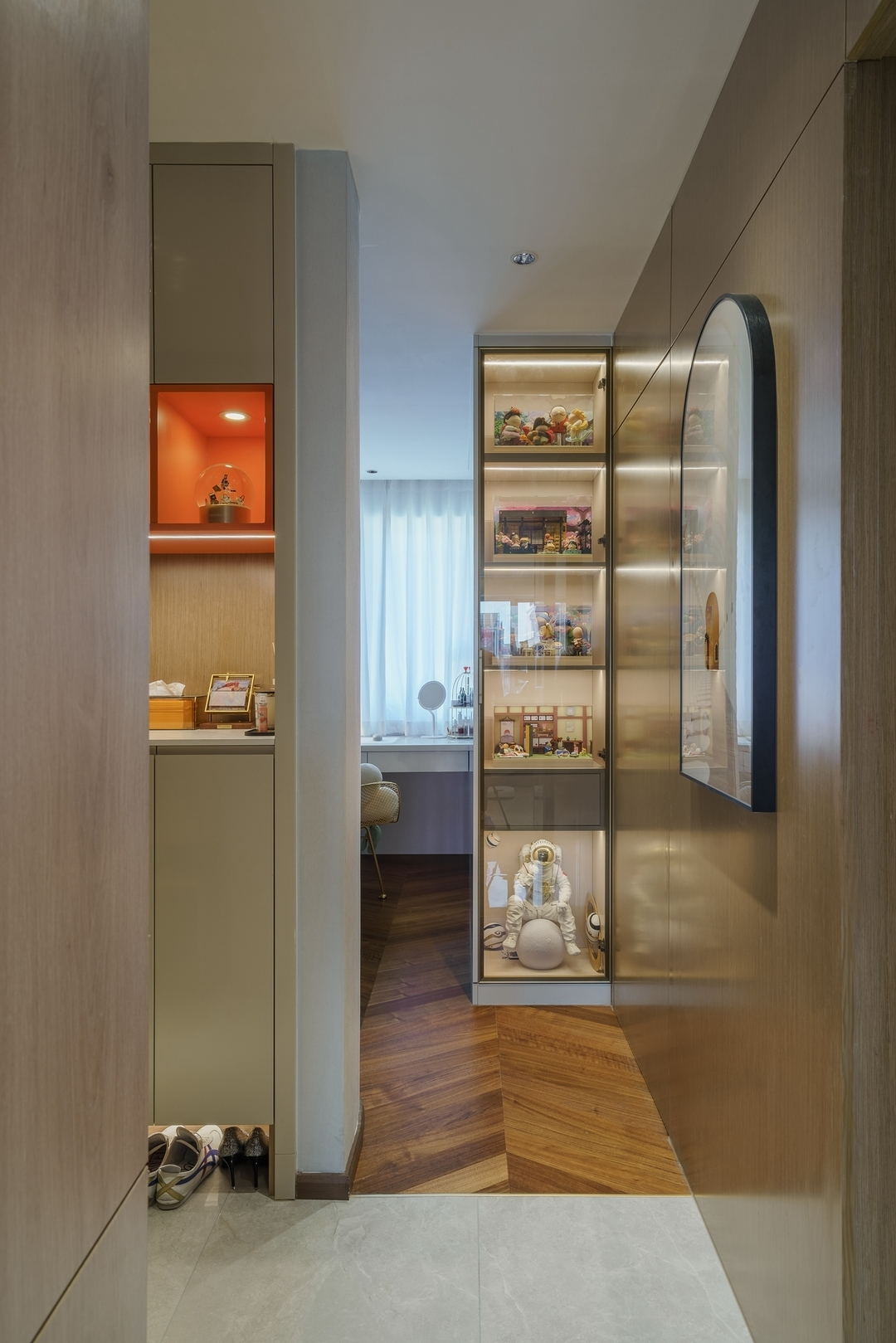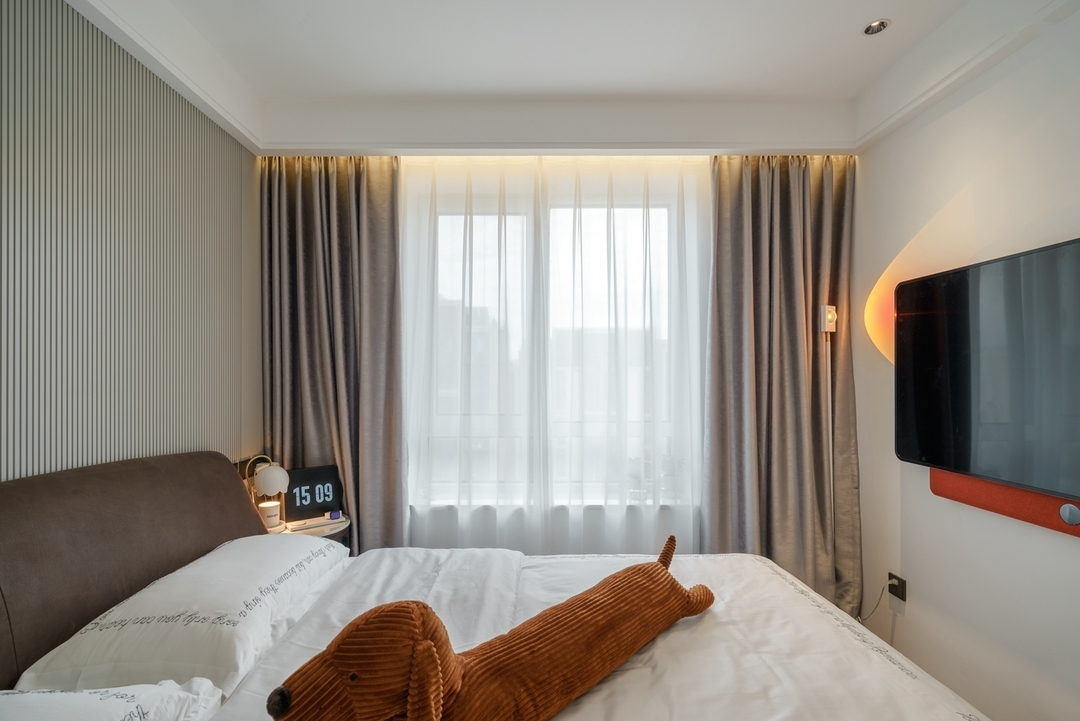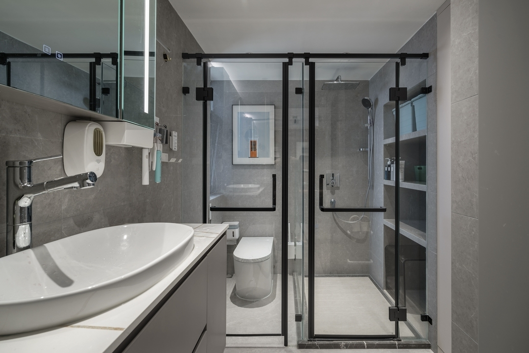 設計策略: 1、原始戶型客餐廳面積緊張,在配色上以淺色為主,局部點綴亮色和深色。 2、全屋進行“隱形式”設計,將門弱化,達到放大空間的效果; 3、衛生間過小,無法滿足日常使用需求,縮小主臥空間,擴大衛生間面積,實現三分離; 4、全屋做到頂儲物柜,滿足收納需求;