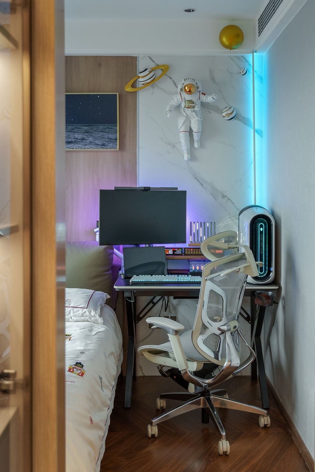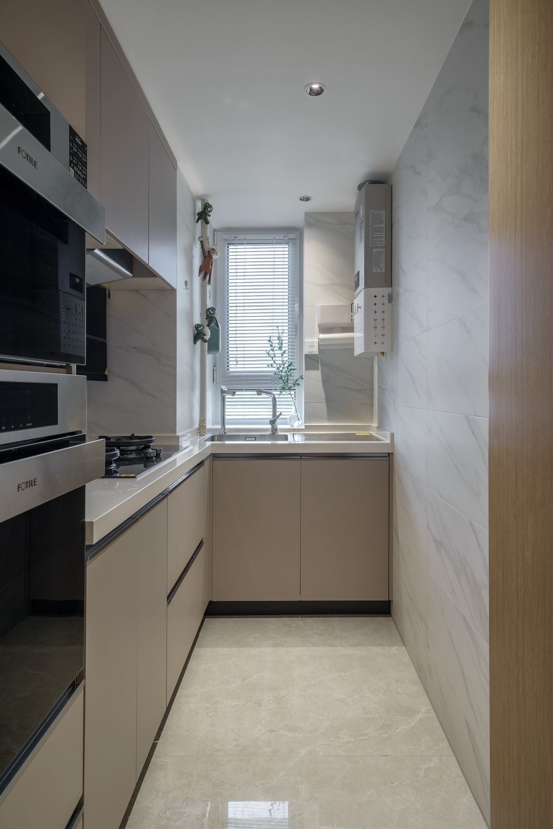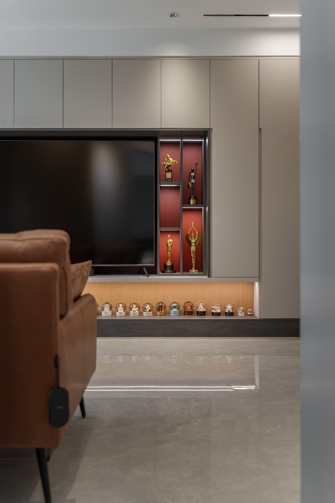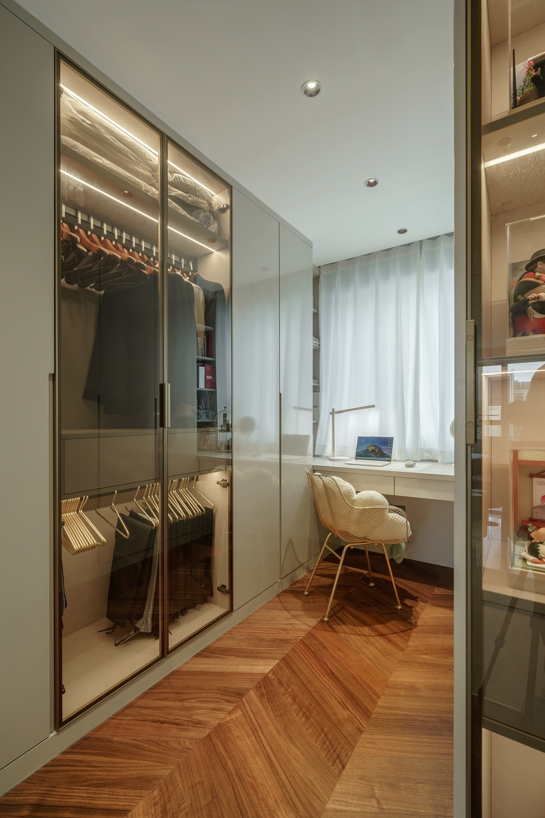 設計策略: 1、原始戶型客餐廳面積緊張,在配色上以淺色為主,局部點綴亮色和深色。 2、全屋進行“隱形式”設計,將門弱化,達到放大空間的效果; 3、衛生間過小,無法滿足日常使用需求,縮小主臥空間,擴大衛生間面積,實現三分離; 4、全屋做到頂儲物柜,滿足收納需求;